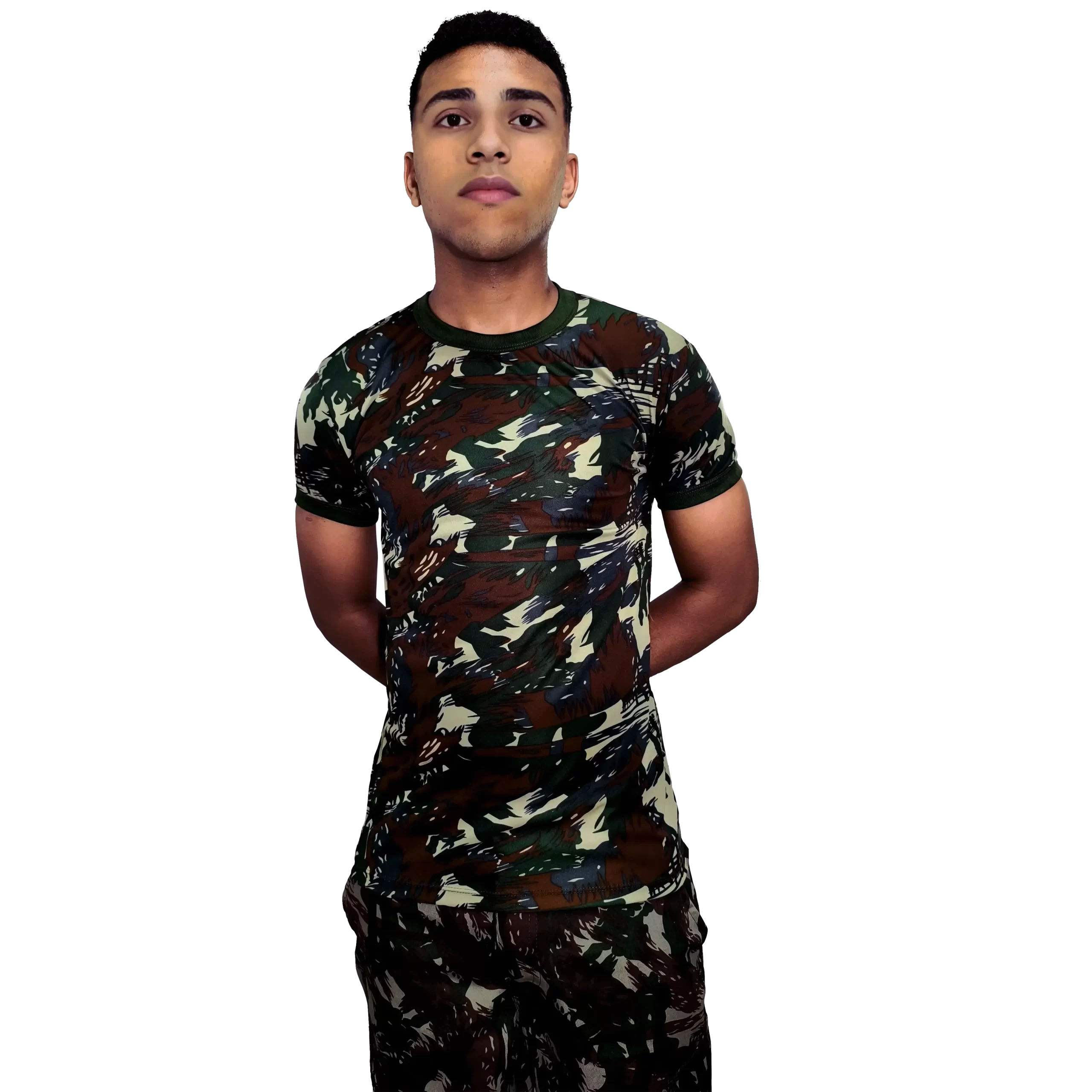 Design: Estampa camuflada padrão do Exército Brasileiro, conferindo um estilo militar autêntico.