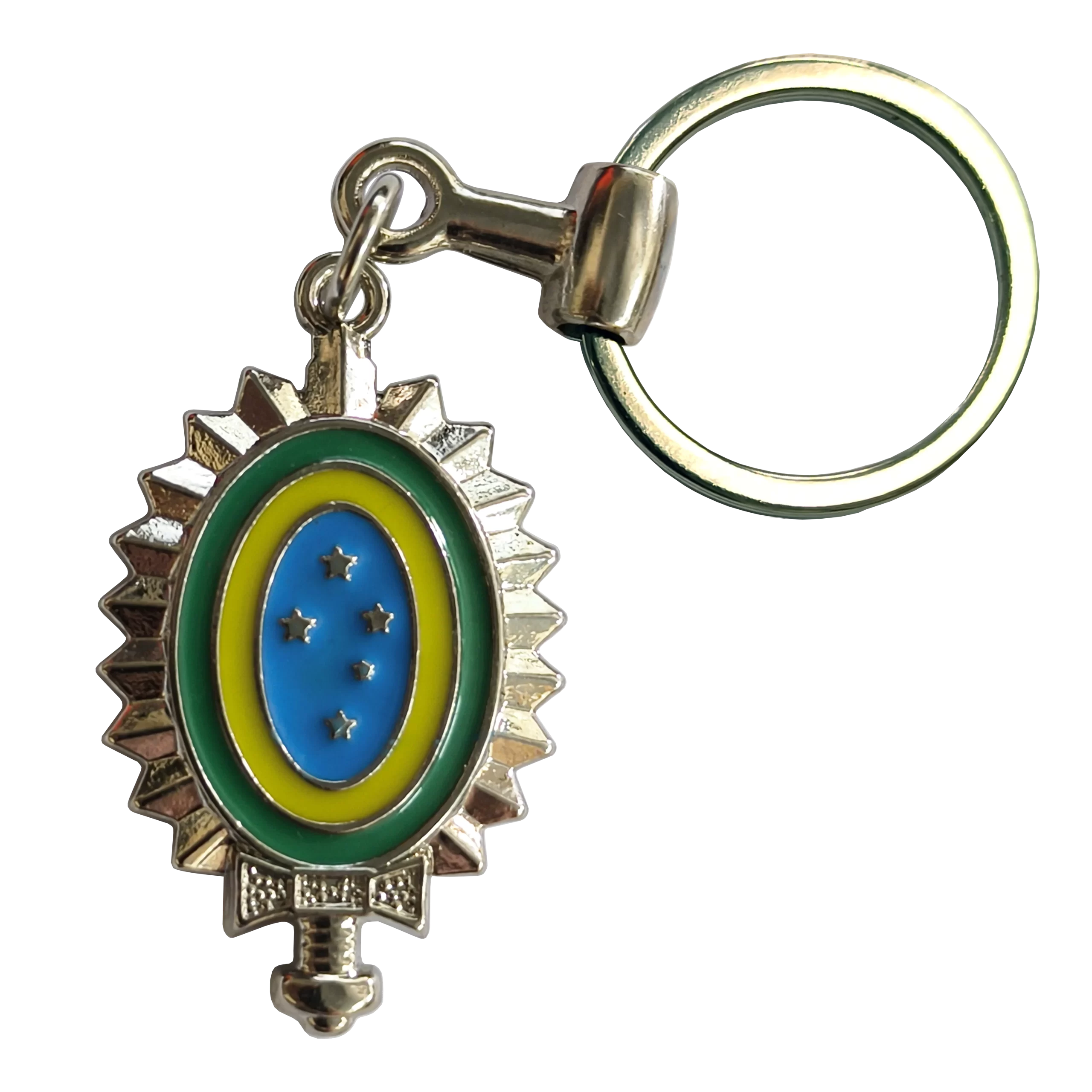 Chaveiro Símbolo do Exército decorativo com design inspirado no icônico formato de Brasão do Exército Brasileiro, perfeito para colecionadores e entusiastas de itens temáticos. Este chaveiro é uma peça fixa, sem partes móveis, projetado exclusivamente para fins decorativos.