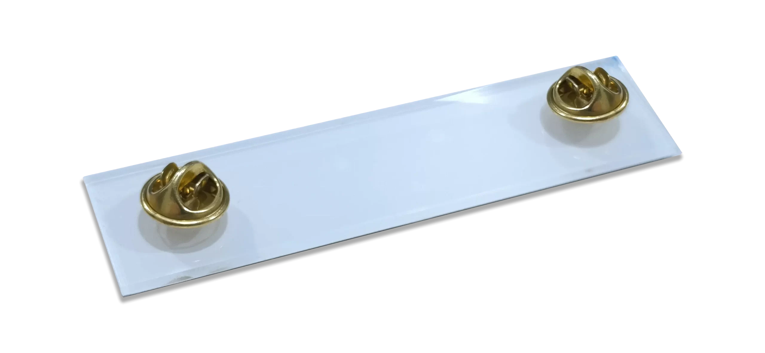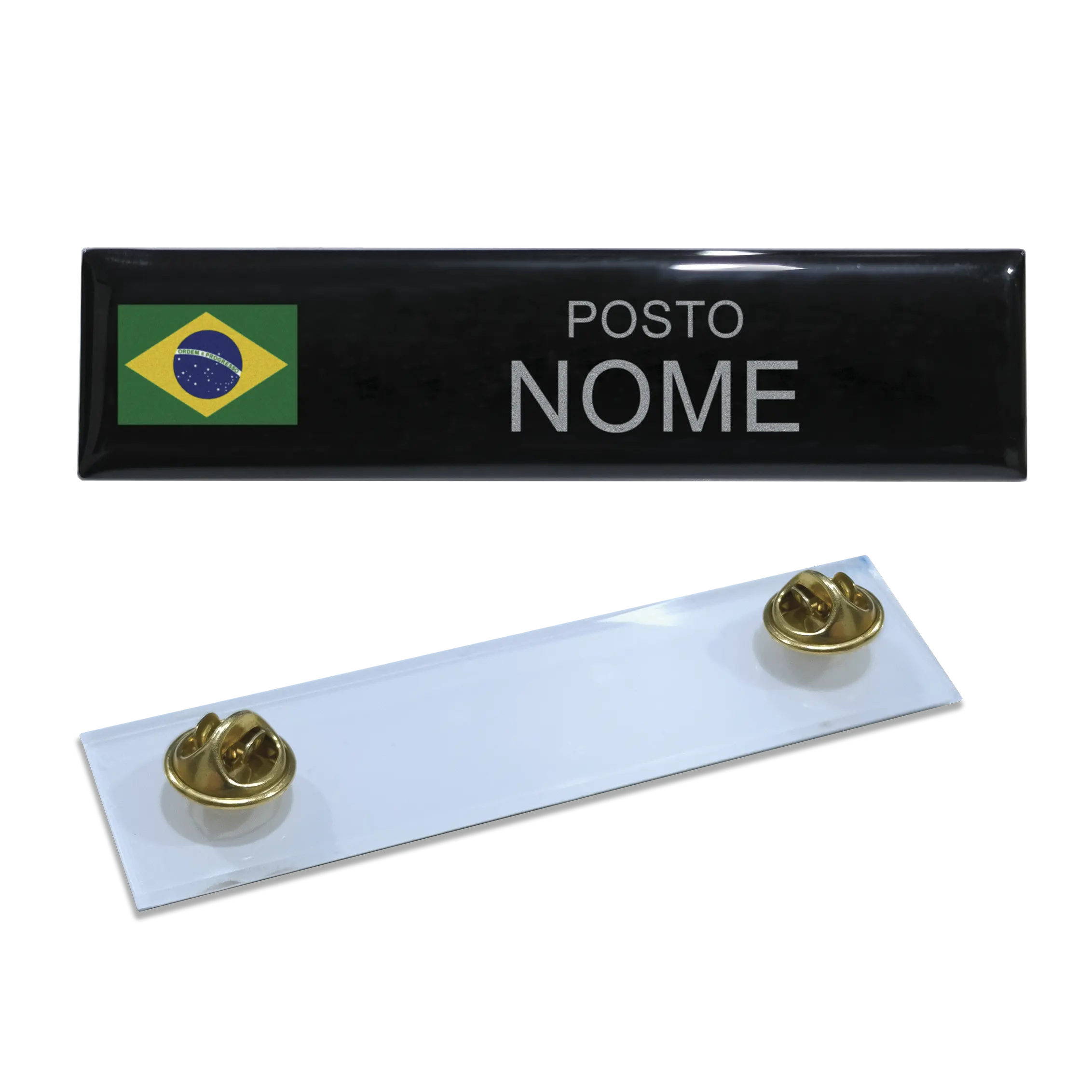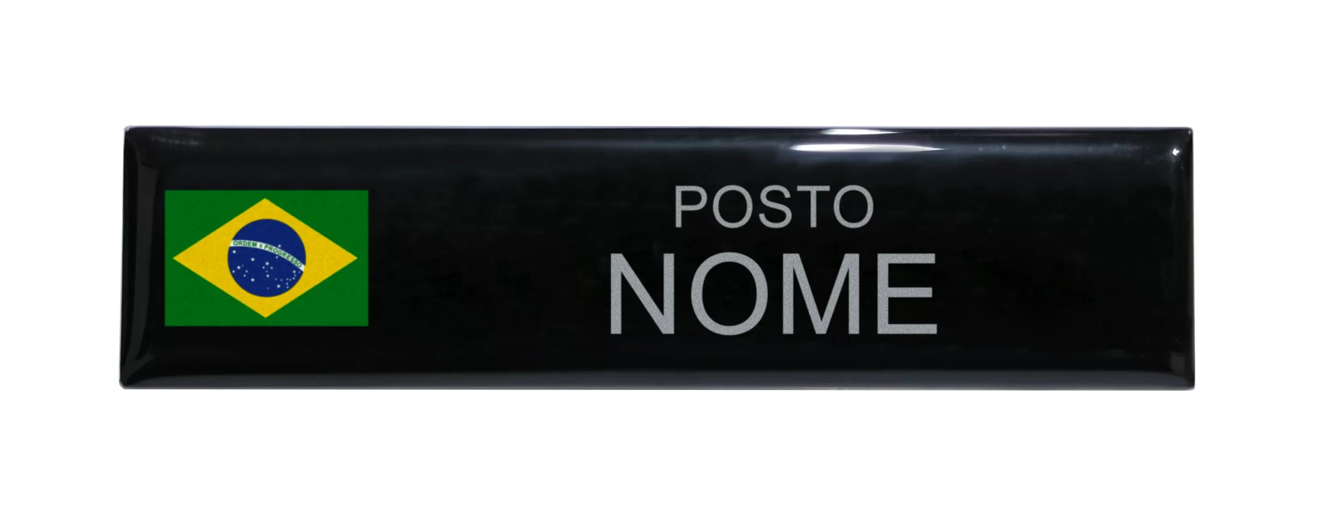 A plaqueta é metálica, com formato retangular de cantos arredondados.